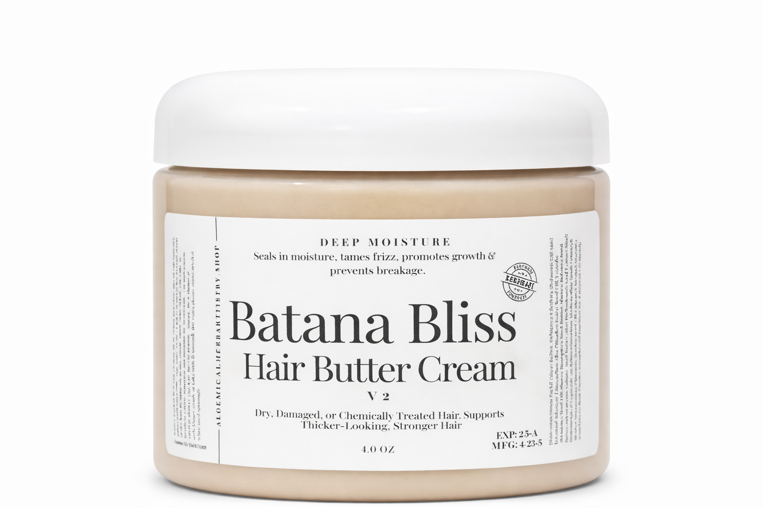 Batana Bliss Hair Butter Cream is a rich, silk-like buttercream designed to deeply nourish, strengthen, and smooth dry, damaged, or chemically treated hair. Crafted with a luxurious blend of Batana-aligned butters, botanical-infused oils, and conditioning actives, this buttercream melts effortlessly into strands to seal in moisture, tame frizz, and support resilient, healthier-feeling hair.